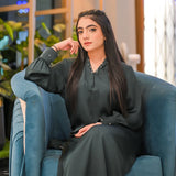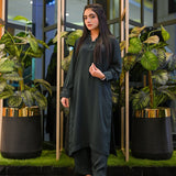 Emerald green silk fabric ensemble, exuding romance and sophistication. Enhanced with fancy sleeves for a touch of elegance, this piece features exquisite detailing with the use of stones adorning the collar and sleeve cuffs.