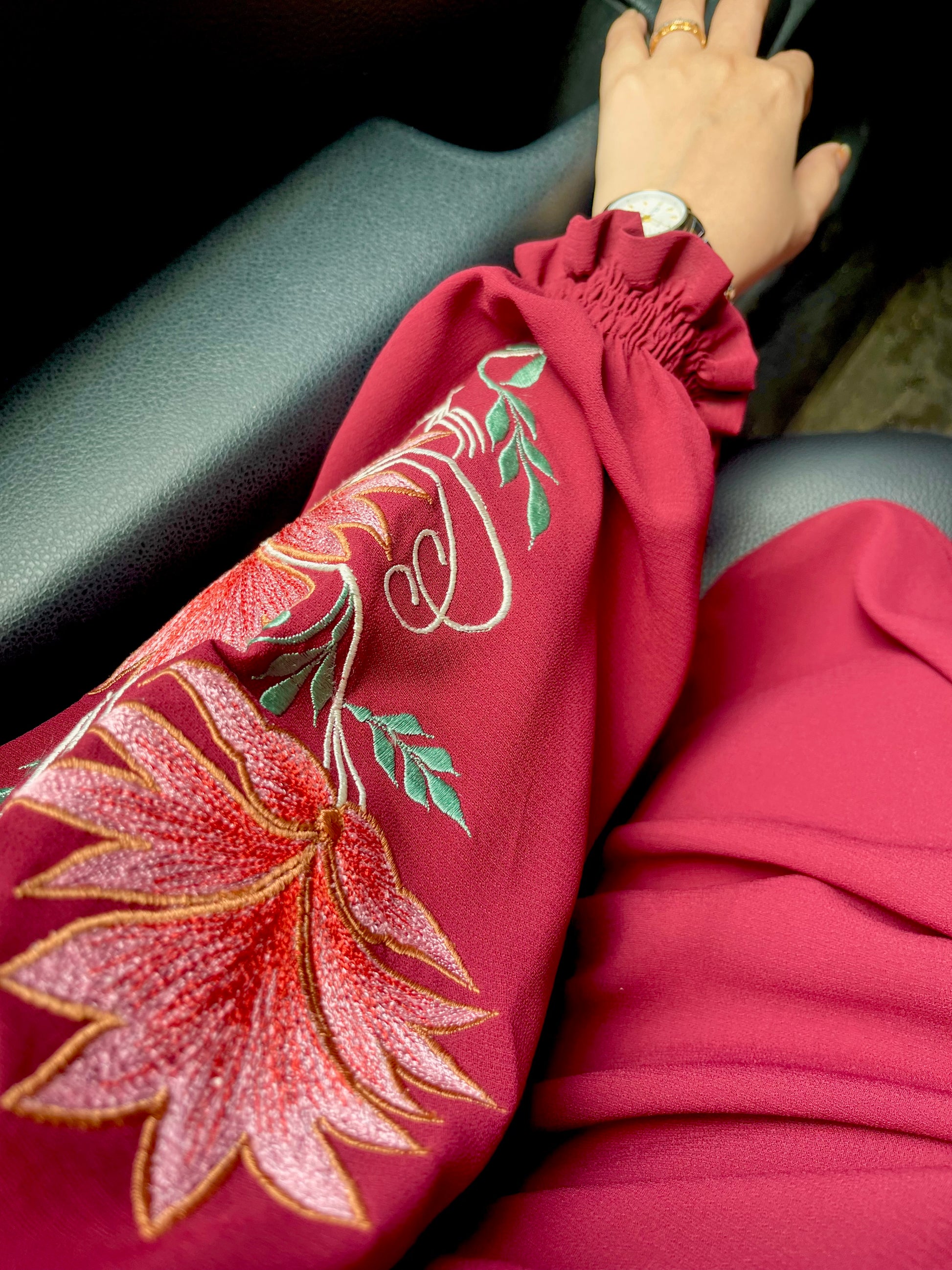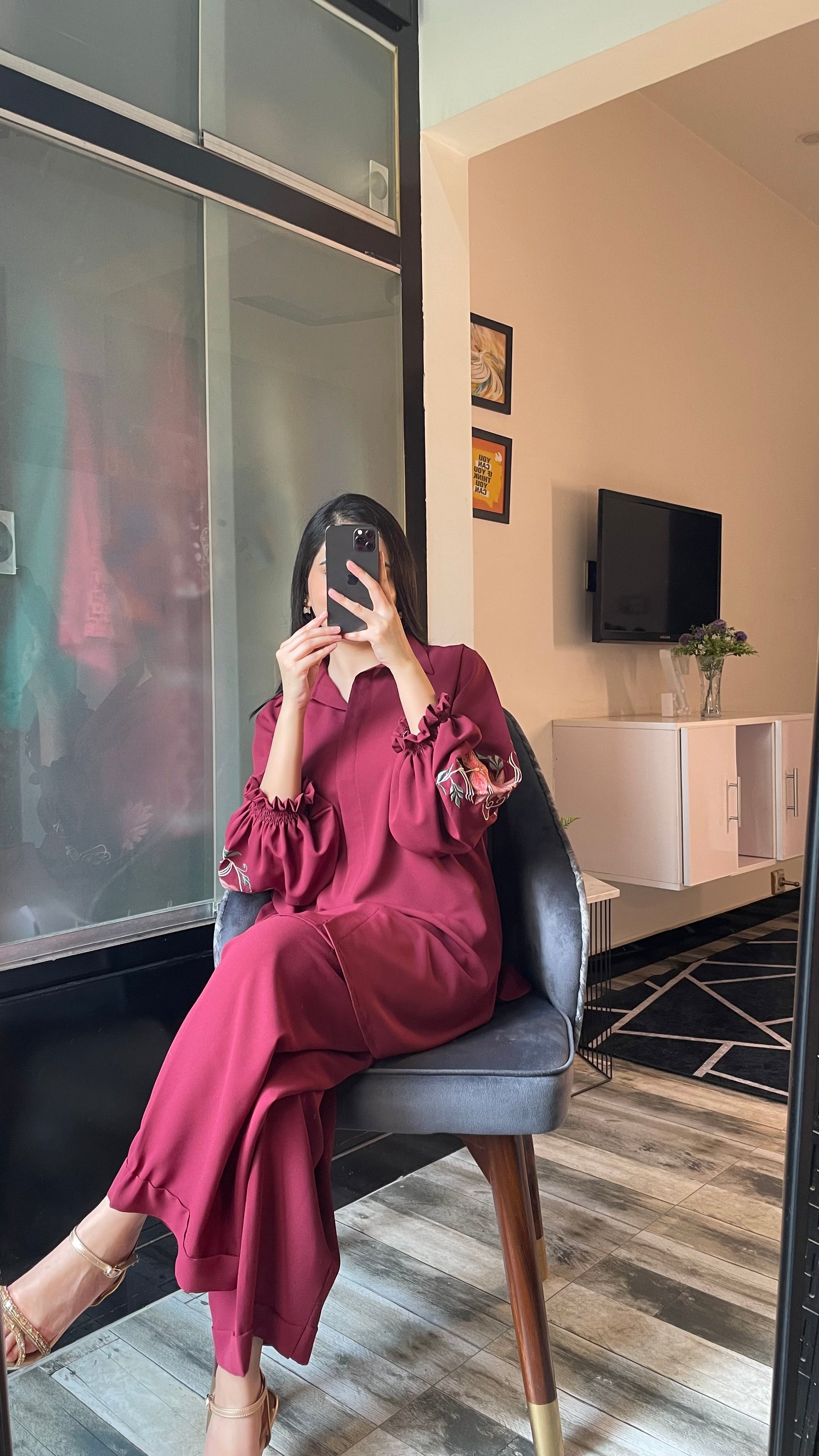 Indulge in luxury with Crimson, a two-piece co-ord stitched from charmeuse fabric. The intricate embroidery along the sleeves elevates the elegance of this premium set