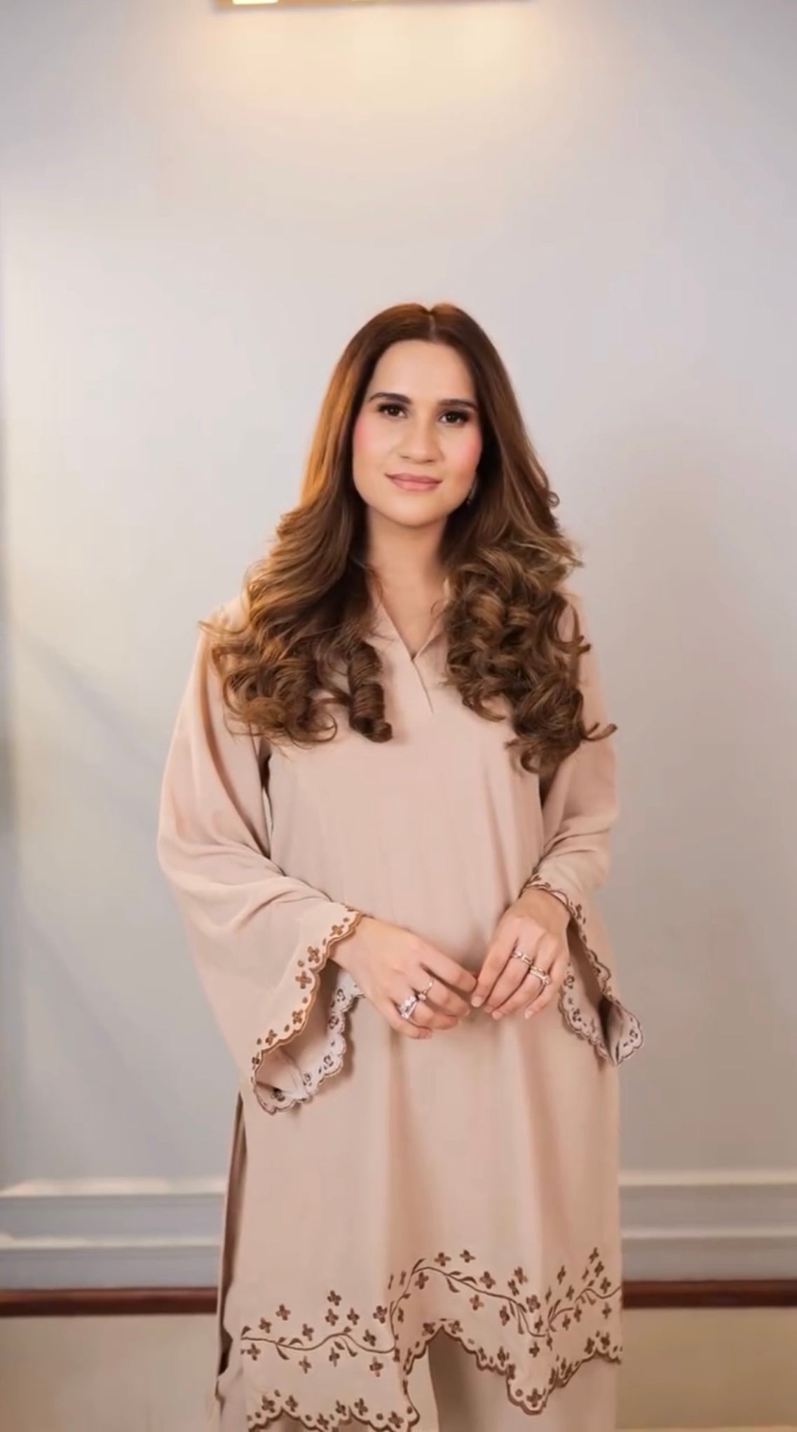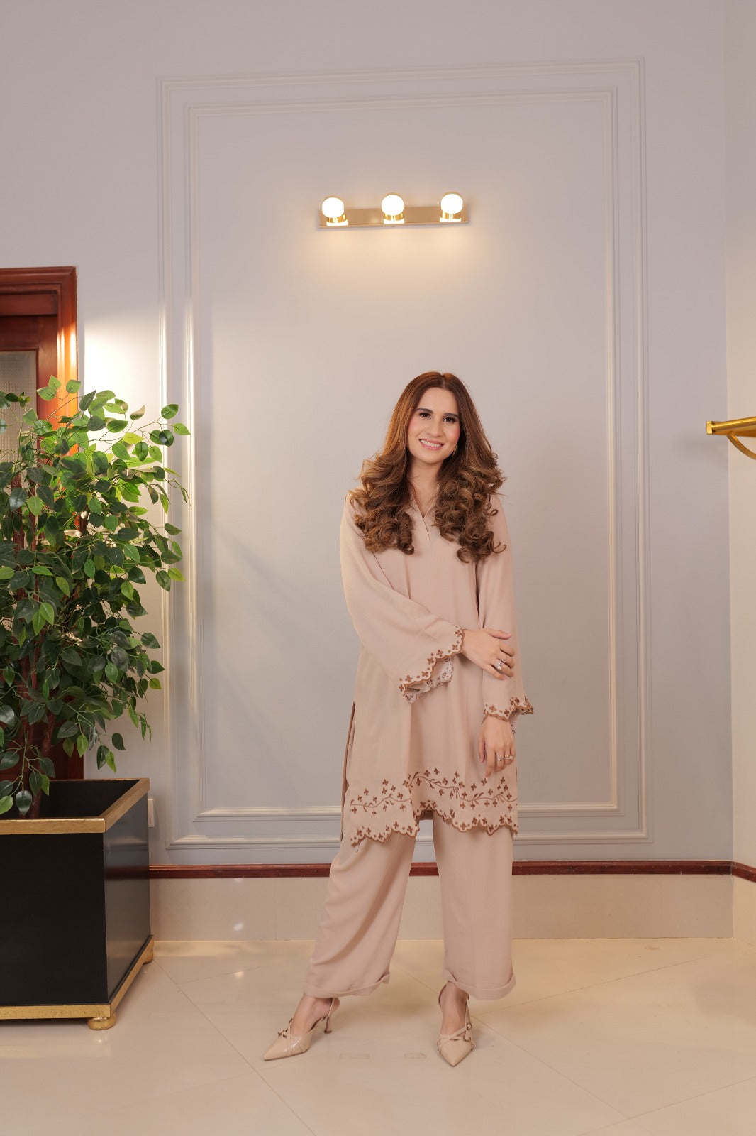 Indulge in luxury with our Ivory two piece co-ord. Crafted from textured crepe fabric, it features intricate embroidery on the sleeves and front border.